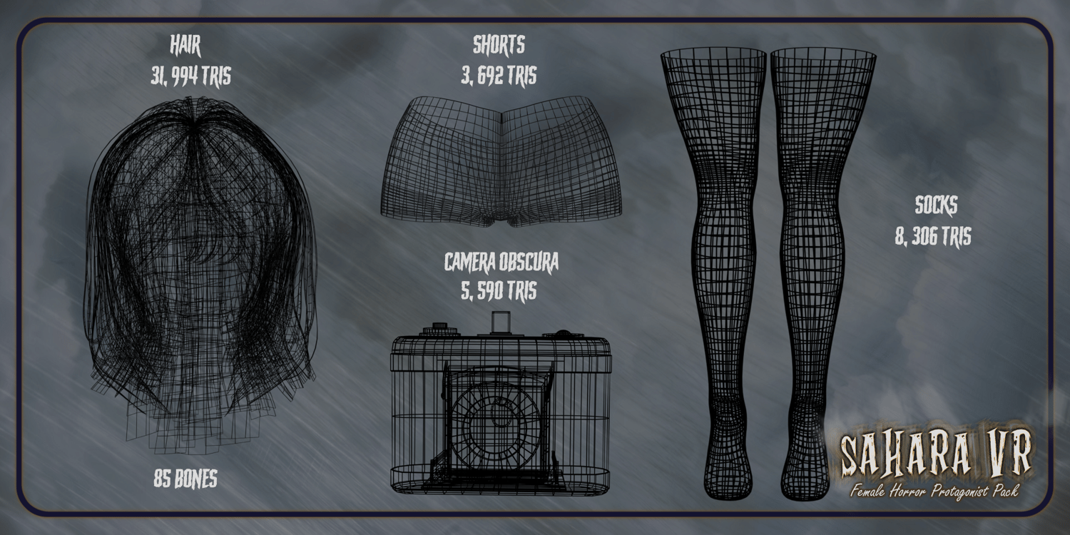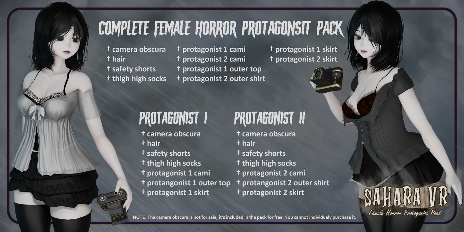 This asset pack is my love letter to my favourite horror franchise growing up: Fatal Frame aka. Project Zero. I had hoped to be able to create a full avatar using this set, however my distaste for unity debilitates my ability to finish avatar projects. I hope that these assets bring you as much joy as playing the games and working on these assets brought me. If you do end up purchasing and using them, I'd love to see what you create! - With love, Sahara