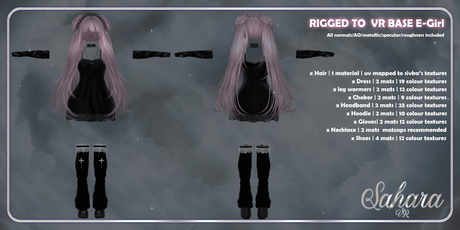Created from scratch by me using blender. Textured in substance painter. Rigged to VRBASE E-GIRL. I really do recommend having basic blender and unity knowledge though for a better experience. Please remember that I am only human and I am more than willing to help you resolve an issue or update a product if it has issues. Please don't hesitate to ask for help. My server is linked above. The hair is UV'd to an edited version of sivka's hair cards alpha (the edited alpha is included in the file). The hair texture itself used for the hair is Sivka's painterly style textures please download those from here.