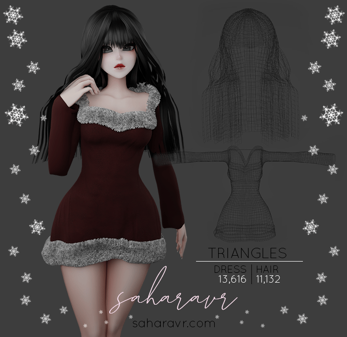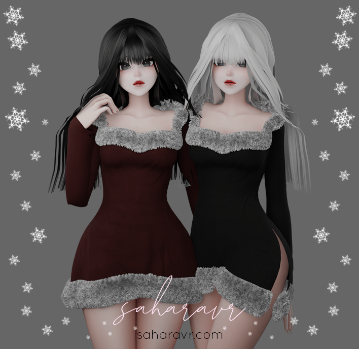 Rigged to Zinpia's RP heeled base. I really do recommend having basic blender and unity knowledge though for a better experience. The hair is UV'd to Cici's hair cards please download them for the textures, they're free. The dress's fur will look as you see here with a fur shader. It does has a fur texture for quest compatibility. I recommend a fur shader for PC though for the best effect. You can remove the fur in blender entirely if you don't care for it or want it as a toggle as I have included 2 AO maps for the dress fabric (with and without fur). The face texture on the model is my red velvet textures.